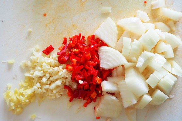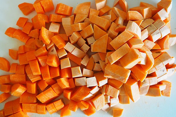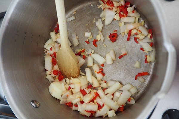 Schil de zoete aardappel en de wortel en snijd deze in stukken. Snipper de ui en snijd de knoflook, gember en rode peper fijn. Indien je het liever niet zo pittig wilt, verwijder dan de zaadlijsten uit de rode peper. Verhit een pan grote op het vuur en fruit hierin de knoflook, ui, gember en rode peper aan. Voeg vervolgens de zoete aardappel en wortel toe en bak dit even mee.