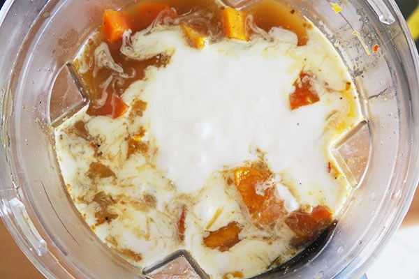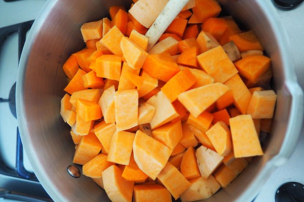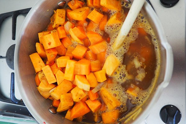 Doe de garam masala erbij en laat dit circa 1 minuut op laag vuur mee bakken en voeg vervolgens de bouillon toe aan de pan. Laat de soep 20 tot 25 minuten zachtjes koken totdat de zoete aardappel en wortel zacht is.
